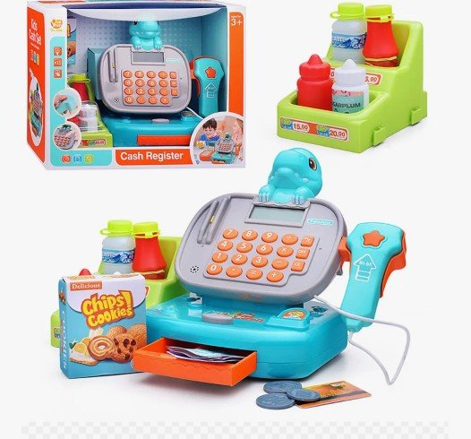 • Размеры кассы (ДхШхВ): 30х21х18 см. В комплекте: - пластиковые монеты (6 шт.) - бумажные купюры (6 шт.) - картонная карта (2 шт.) Функции кассы: - денежный ящик открывается с кнопки "OPEN". - встроенный калькулятор с электронным дисплеем. - мягкие кнопки кассы при нажатии звучит писк. - при нажатии кнопки сканера звучит писк. Для работы кассы нужны 2 батарейки "АА" (не входят в комплект). Материалы: пластик, картон, бумага. Соответствует требованиям безопасности и стандартам качества продукции. Для детей от 3-х лет.