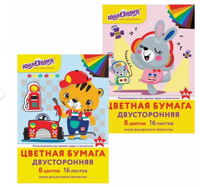 - Цветная бумага А4 2-сторонняя офсетная, 16л. 8цв., на скобе, ЮНЛАНДИЯ, 200х280мм, (2 вида), 129558