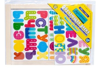 Основное отличие от остальных пяти досок серии в том, что в комплект входит 50 красочных магнитных букв (33 буквы для знакомства с алфавитом + 17 дополнительных для возможности составления слов). Высота каждой буквы 4 см, толщина - 3 мм.