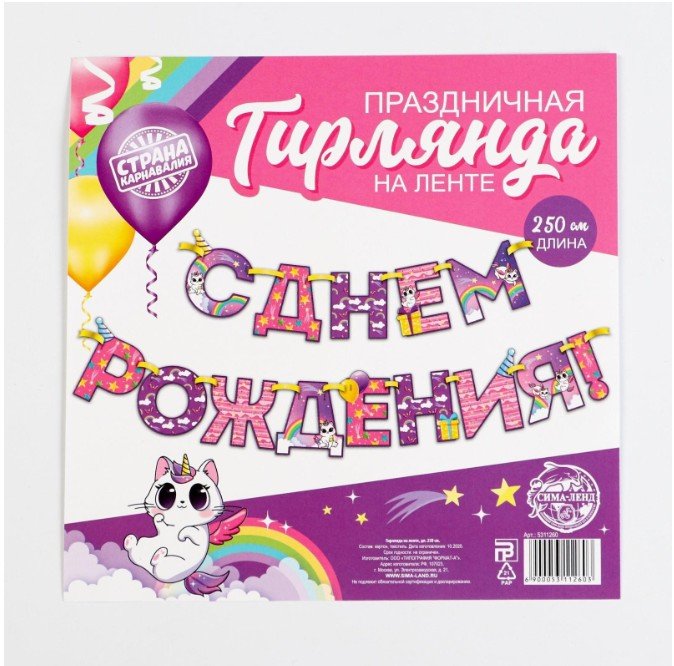 Гирлянда на ленте «С Днем Рождения!», радужный котик, длина 250 см